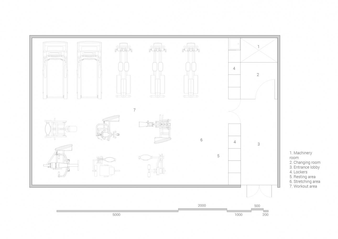 Smart Sharing Fitness Box was designed to be installed temporarily in locations such as city compounds, office buildings and university campuses. The architectural design concept adopted the QR code scanning system throughout: at the entrance door, to access equipment and lockers. The material used for the facade was chosen to be consistent with an urban sports facility while also being very cost-effective, easy to maintain and easy to assemble onsite. The inclined ceiling of the box gave a modern visual effect to the whole, making the ceiling light a city landmark when viewed from the outside. At the same time it helped to give the impression of increased space.