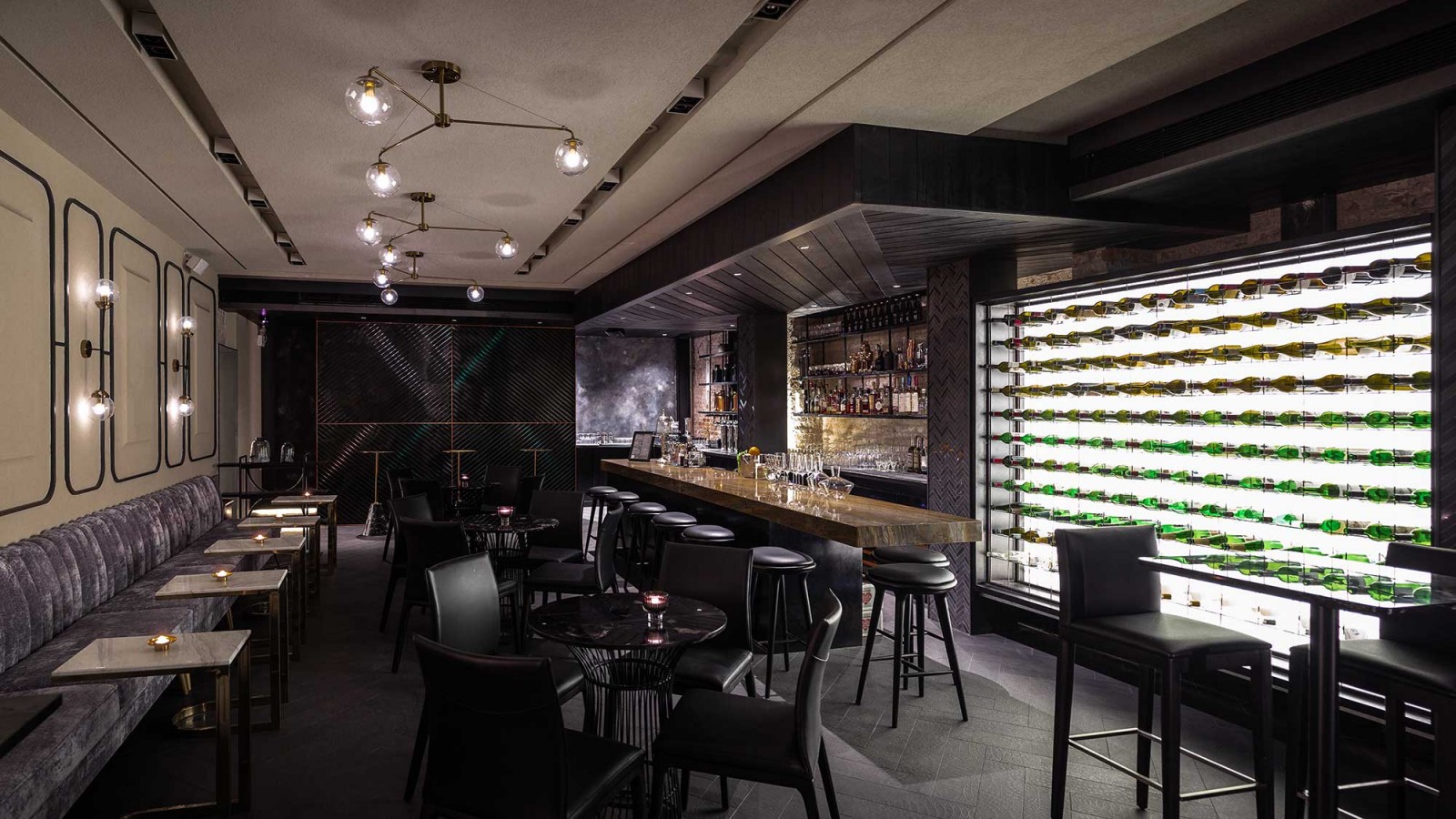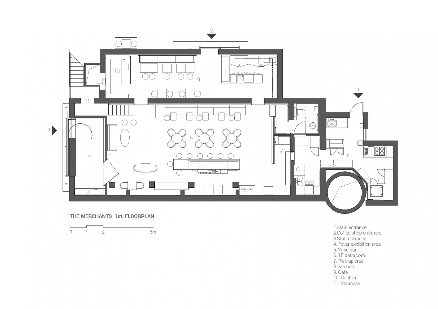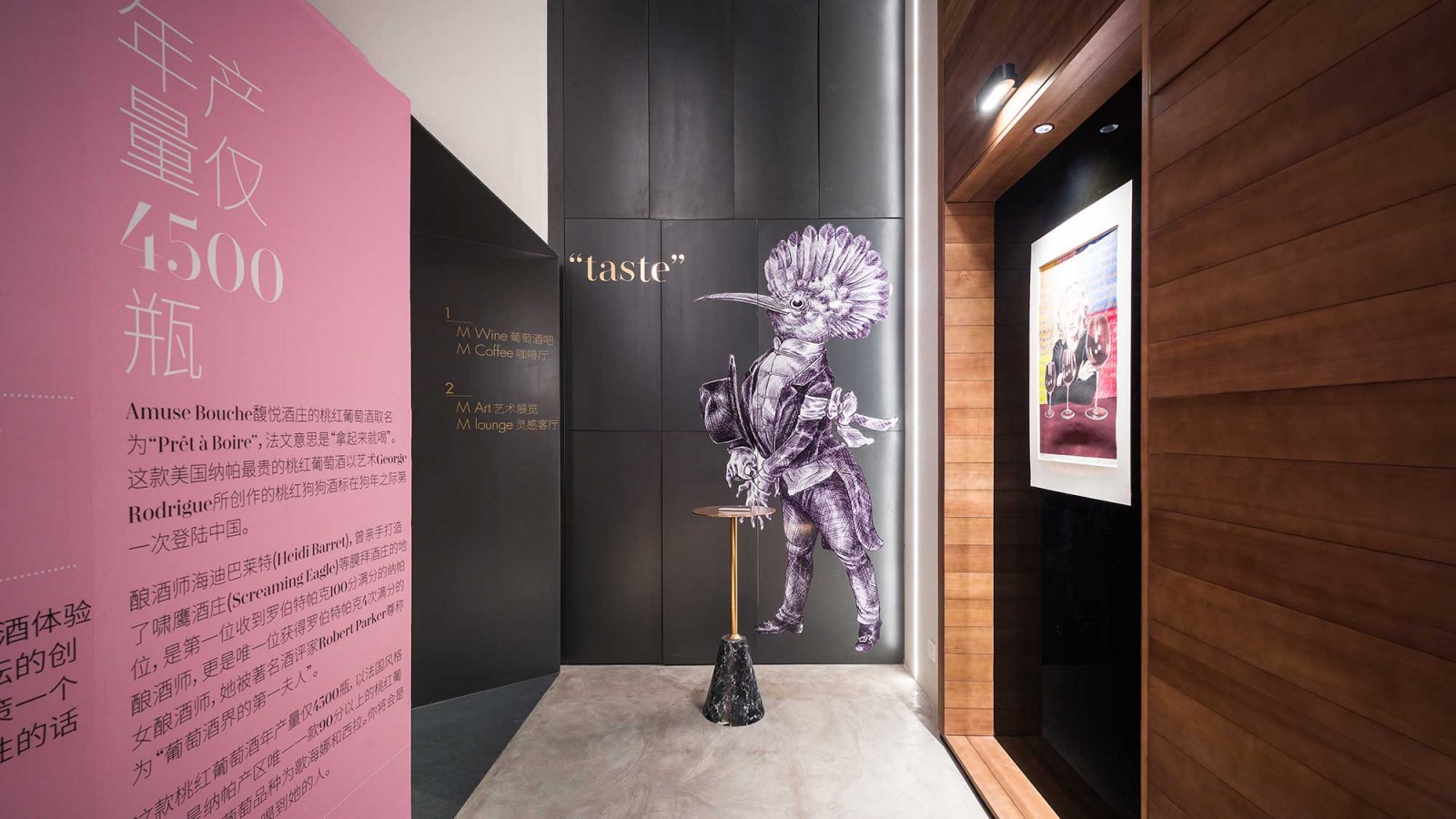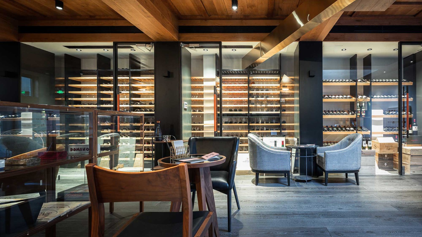 Interior design for The Merchants wine bar located in the Dongcheng district of Beijing. The space was divided into five main rooms. The foyer, where one enters, doubles as an exhibition area for temporary art exhibitions. The wine bar is a space dedicated to wine and cocktails. The coffee shop serves gourmet food to the daytime customer.