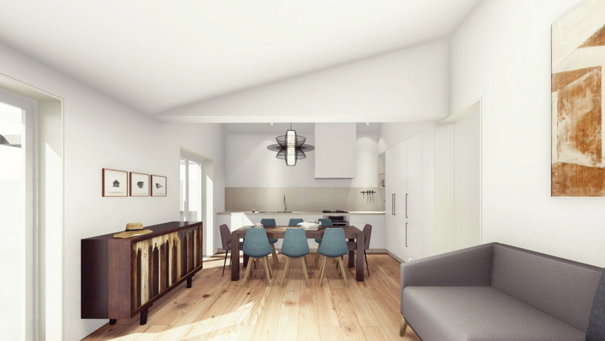 This small house is located on a quiet road in the Ajuda district of Lisbon. Previously it was divided into many very small rooms. We used the high ceilings as an opportunity to create two mezzanine beds, while connecting the living/social space smoothly to the large terrace. This resulted in the whole space being opened up visually, allowing natural light to flow.